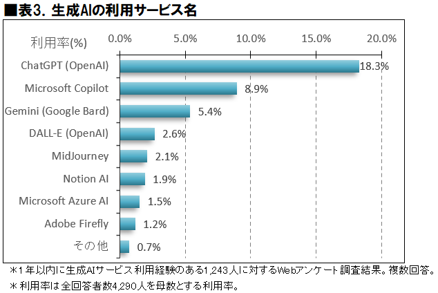 ICT総研が2024年6月に実施したアンケート調査では、4,290人のアンケート対象者のうち29%の回答者が一年以内になんらかの生成AIサービスの利用経験があると回答した。サービス利用経験者の中で最も利用率が高かったのはChatGPT(OpenAI)であり、全体の18.3%を占めた。次いで、Microsoft Copilotが8.9%、Gemini(Google Bard)が5.4%、DALL-E(OpenAI)が2.6%、MidJourneyが2.1%、Notion AIが1.9%、Microsoft Azure AIが1.5%、Adobe Fireflyが1.2%となっている。「その他」と回答した者は0.7%であった。