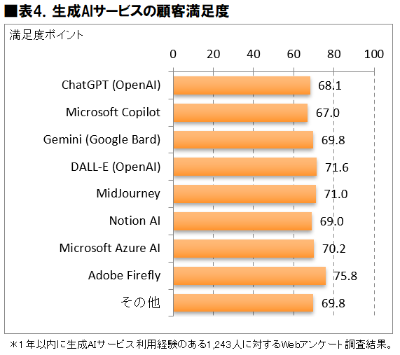 利用者満足度1位はAdobe Fireflyで75.8ポイント、DALL-Eが 71.6ポイントで続く