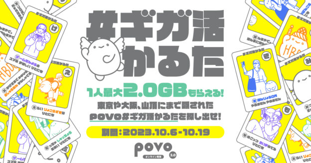 さらに「povo2.0の2周年キャンペーン」の第2弾として、10月19日までの期間限定で東京/大阪に設置された46種類の「povo#ギガ活かるた」を見つけると、その場でギガをもらえるイベントを実施する。