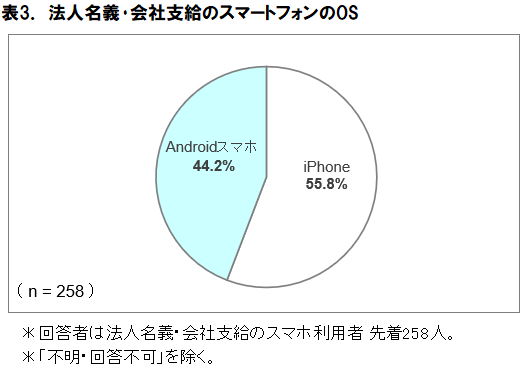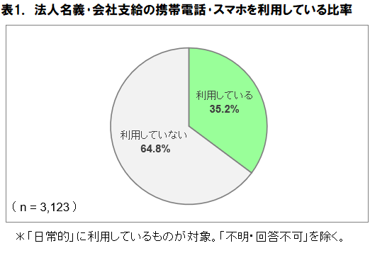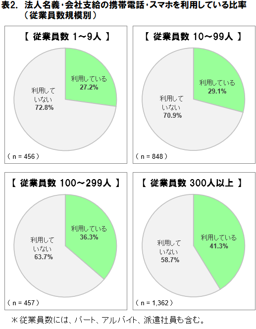 法人名義の携帯電話・スマートフォンを日常的に利用している比率は、35.2% ー ICT総研 ICT総研は12月5日、法人のスマートフォン利用実態調査の結果を発表した。 総務省の公開データでは、日本の携帯電話契約数は2024年6月末時点で2億1,605万契約(IoT回線等を含む)。これは、個人契約の端末と法人契約の端末を全て含んだ数値である。今回の調査ではこのうち、法人契約のスマートフォンの利用実態を把握することを目的としたとのこと。法人名義の携帯電話・スマートフォンを日常的に利用している比率は、35.2% 20代以上のアンケートモニターにWebアンケート調査をした結果、法人名義・会社支給の携帯電話・スマートフォンを日常的に「利用している」と回答した回答者は全体の35.2%。「利用していない」が64.8%であった。中小企業では、従業員数規模が大きいほど法人名義端末の利用率が高い 従業員数規模別に見ると、従業員数1~9人では「利用している」が27.2%、従業員数10~99人では29.1%、従業員数100~299人では36.3%であった。この規模の中小企業で見た場合、従業員数規模が大きいほど、法人契約の携帯電話・スマートフォンの利用率が高いことが読み取れる。ちなみに、従業員数300人以上では41.3%であった。法人名義スマートフォンをOS別に見ると、iPhone 55.8%。Androidスマホ 44.2% 法人契約のスマートフォンを日常的に利用しているユーザーに対して、そのOSを尋ねたところ、iPhoneが55.8%、Androidスマートフォンが44.2%であった。iPhoneがやや優勢という結果となる。セキュリティ面、管理者側の管理のしやすさなどが、iPhone利用者がやや多い要因であると考えられるとのことだ。
