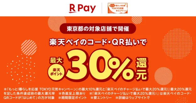 「楽天ペイ」、東京都のキャンペーンとあわせて最大30%還元のキャンペーンを実施 楽天ペイメントは、運営するキャッシュレス決済サービス「楽天ペイ」において、東京都が12月11日から実施する「もっと!暮らしを応援 TOKYO元気キャンペーン」とあわせて、最大30%還元キャンペーンを実施することを発表した。 「もっと!暮らしを応援 TOKYO元気キャンペーン」は、長引く物価高騰の影響を受ける都民や事業者への支援策として、東京都内の店舗でコード決済を使用し、買い物をした人にポイントを還元するもの。利用者は、東京都内の対象店舗において、キャンペーン期間中に「楽天ペイ」のコード決済を利用して支払いをすると、決済金額に対して最大10%分の「楽天ポイント」が還元される。 また、現在実施中の「楽天ペイのチャージ払いで最大20%還元!」キャンペーンは、キャンペーン期間中にエントリーのうえ、「楽天ペイ」で「楽天キャッシュ」を支払い元に設定のうえ、コード決済で支払うと、最大20%の「楽天ポイント」が還元される。「楽天ペイ」ではじめて支払いをするユーザーには全員に、いつも利用をしているユーザーには抽選で1000名に、最大20%分の「楽天ポイント」を還元する。そのため、「もっと!暮らしを応援 TOKYO元気キャンペーン」と同時期に開催する「楽天ペイのチャージ払いで最大20%還元!」キャンペーンとあわせて参加することで、合計で最大31.5%分の「楽天ポイント」が還元される。