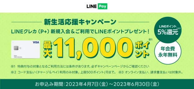 LINE Payは、4月7日から6月30日までの間、LINEクレカ(P+)に新規入会し、キャンペーン条件を達成したユーザーに、LINEポイント最大1万1000ポイントをプレゼントする「新生活応援キャンペーン」を開催する。 「LINE Pay」は、LINE上で使用できるモバイル送金・決済サービスに加え、カードショッピングのご利用時にLINEポイントを貯めることができるクレジットカード・LINEクレカを2020年4月より提供している。2022年11月より、新しい商品ラインナップとしてLINEクレカ(P+)を加え、「LINE Pay」とLINEクレカ双方を使用するユーザーに、さらにリーズナブルで利便性の高い決済体験を提供しているとのこと。