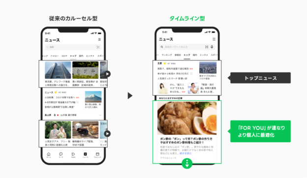 LINEは、スマートフォン向けニュースサービス「LINE NEWS」にて、LINE NEWSの個人化を今後より強化していく戦略の第一歩として、UIデザインをタイムライン型に大幅リニューアルし、まずはLINE NEWSユーザーの約20%にあたる約1500万人に向けて提供開始、来春以降の全面移行を目指すことを決定したと発表した。