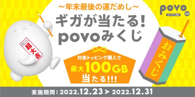 KDDIと沖縄セルラーは12月23日から12月31日まで、povo2.0のデータトッピングおよびコンテンツトッピングの購入で最大100GB当たる「ギガが当たる!povoみくじ~年末最後の運だめし~」を開催する。