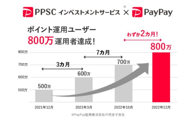 PPSCインベストメントサービスとPayPayは、キャッシュレス決済サービス「PayPay」のミニアプリで提供する疑似運用体験ができるサービス「ポイント運用」がこの12月に、2020年4月15日のサービス提供開始からおよそ2年8カ月で、800万運用者を突破したことを発表した。これはポイント運用サービスを提供する主要なポイント運用サービス取扱業者で最速記録とのこと。これを記念して本日より「800万人達成記念!ポイント運用はじめようキャンペーン」を実施するとのことだ。
