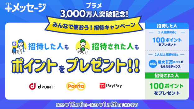 同キャンペーンでは、すでに「+メッセージ」を利用している人が、現在利用していない人を招待すると、招待した人と招待された人にそれぞれポイントをプレゼントする。なお、プレゼントするポイントは契約の携帯電話会社によって異なり、ドコモは「dポイント」、KDDIは「Pontaポイント」、ソフトバンクは「PayPayポイント」となる。