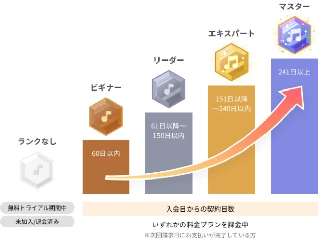 同プログラムは、「Rakuten Music」ユーザーの利用日数に応じて会員ランクを設け、ランクに応じた特典が受けられるプログラムとなっている。「ビギナー」、「リーダー」、「エキスパート」、「マスター」の4つの会員ランクがあり、継続的にサービスを利用することで会員ランクをアップさせることが可能。なお、会員ランクは「Rakuten Music」のアカウント情報から確認することができるとのこと。