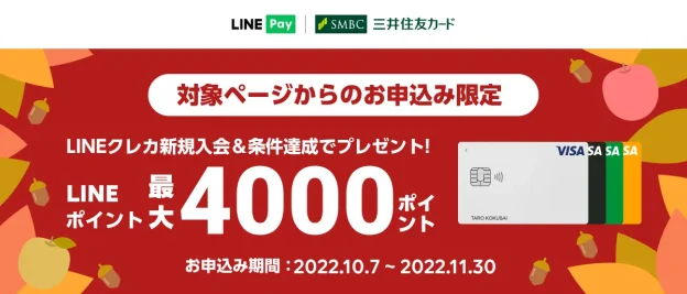 LINE Payは、10月7日から11月30日まで、LINEクレカに新規入会し、キャンペーンの条件を達成したユーザーに、最大LINEポイント4000ポイントをプレゼントする「秋の感謝祭」を開催する。