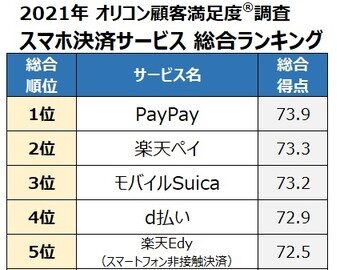 2020年に次いで2回目の発表となる今回は、満足度総合得点73.9点でPayPayが、総合1位を獲得した。また評価項目別「ポイント・キャンペーン」でも1位を獲得したほか部門別では、男女別「女性」、年代別「10・20代」「30代」「40代」「50代」、決済種別「コード決済」でもそれぞれ1位となった。なお、年代別「10・20代」で獲得した79.8点は、総合・評価項目別・部門別を発表した当ランキングの中で最も高く、とくに若い世代からの評価が高いことが伺える結果となった。