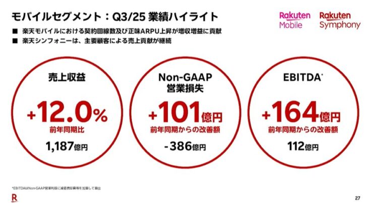 総契約回線数は2025年10月時点で950万回線(MVNOおよびBCP含む)に達した。三木谷浩史会長は「2025年内に1000万回線を目指す」とし、引き続き顧客基盤の拡大を進める姿勢を示した。MNP(番号そのまま乗り換え)純増数は9万5000回線で、前年同期(11万9000回線)からは減少したが、第2四半期(5万6000回線)からは71.4%増と持ち直した。三木谷氏は「他キャリアのプラン改定などの中で、楽天モバイルの純増数は増加トレンドを維持している」と述べた。