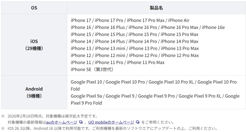 このサービスは、auおよびUQ mobileを利用しているユーザーを対象に提供される。2026年2月18日時点での対応機種は全38機種となっており、内訳はiOS端末が29機種、Android端末が9機種だ。iOS側では、最新のiPhone 17シリーズやiPhone 16シリーズをはじめ、iPhone 11やiPhone SE(第3世代)まで幅広くカバーされている。一方、Android側ではGoogle Pixel 10シリーズやGoogle Pixel 9シリーズといった最新ラインナップが名を連ねている。これらの機能を利用するためには、iOS 26.3以降、またはAndroid 16以降の最新ソフトウェアへのアップデートが必要不可欠である。現時点では対応機種が限定されているものの、KDDI側は今後、対象となるスマートフォンを順次拡大していく方針を示している。