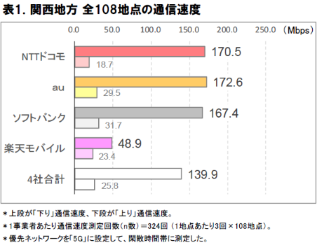 調査の結果、関西地方 全108地点の下り通信速度は、auが172.6Mbpsでトップ。NTTドコモ70.5Mbps、ソフトバンク 167.4Mbps、楽天モバイル 48.9Mbpsと続いた。4社平均の下り通信速度の平均は、139.9Mbpsである。過去の調査では北海道・東北地方、中国・四国地方、中部地方ではソフトバンクが下り速度がトップ、九州・沖縄地方ではNTTドコモがトップであった。関西地方では、大手3社の下り通信速度の差が小さく、僅差の争いとなっている。 府県ごとに見ると、京都府でauがトップ、大阪府、和歌山県ではソフトバンクがトップ、兵庫県、滋賀県、奈良県ではNTTドコモが下り通信速度トップであった。 また、全108地点の上り通信速度はソフトバンクが31.7Mbpsでトップ。au 29.5Mbps、楽天モバイル 23.4Mbps、NTTドコモ 18.7Mbpsという結果であった。上り速度の事業者間の差の小ささは、他の地方と同様の傾向である。