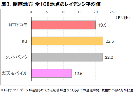レイテンシ(遅延時間)は値が小さい方が利用にあたって快適だとされるが、全108地点のレイテンシ(遅延時間)は楽天モバイルが12.5ミリ秒で最短であった。NTTドコモ(19.9ミリ秒)、ソフトバンク(22.0ミリ秒)、au(22.3ミリ秒)と続いている。他の地方と同様に、楽天モバイルの遅延時間の短さが目立っている。 全108地点のレイテンシの4社平均は、19.2ミリ秒。これは、他の地方と比べて最も短く、良好な数値である。