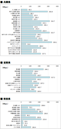 測定地点ごとに見ると、今回調査における下り通信速度の最速地点は兵庫県のノエビアスタジアム神戸であり、4社平均下り速度は339.1Mbpsであった。他に300Mbpsを超えた地点は、近江八幡駅(317.2Mbps)、サンガスタジアム(316.1Mbps)、姫路駅(314.7Mbps)、神戸市役所(313.7Mbps)、キーノ和歌山(302.3Mbps)である。一方で、4社平均の下り速度が最も遅かったのは、銀閣寺(15.0Mbps)であった。他に30Mbpsを下回った地点は、奈良公園バスターミナル(15.8Mbps)、東大寺南大門(19.6Mbps)、金閣寺(21.2Mbps)、阪急梅田本店(21.7Mbps)、法隆寺(23.1Mbps)、心斎橋駅(25.8Mbps)である。関西地方は他の地方と比べて、4社平均の下り通信速度が極めて速い地点も多いが、遅い地点もまた多い結果となった。 ICT総研では今後も、「つながりやすさ」や「通信速度」について、ユーザーが利用するさまざまなシーンを想定し、ユーザーにとって指標となる実測データを定期的に提供していく方針である。