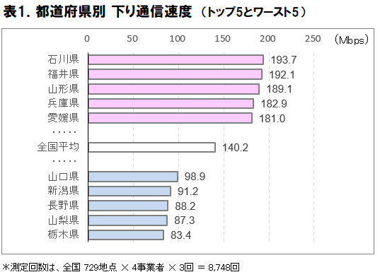一方で、下り通信速度のワーストは栃木県であり、83.4Mbpsに留まった。山梨県(87.3Mbps)、長野県(88.2Mbps)がワースト2、ワースト3であり、新潟県(91.2Mbps)、山口県(98.9Mbps)を含めた5つの県が平均100Mbpsを下回った。下り通信速度の全国平均は140.2Mbpsである。