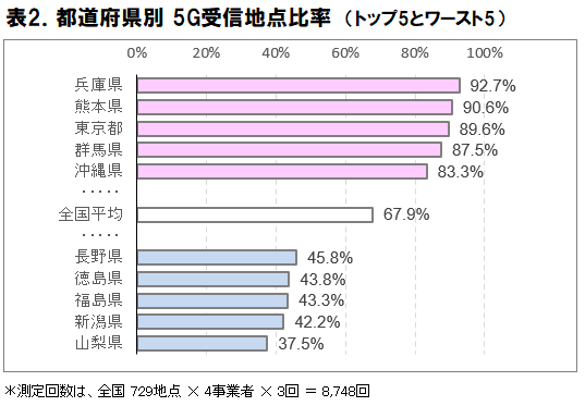 一方で、5G受信地点比率ワーストは山梨県であり、37.5%に留まった。新潟県(42.2%)、福島県(43.3%)がこれに続いた。5G受信地点比率の全国平均は、67.9%であった。