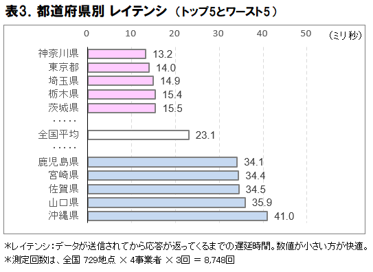 レイテンシ(遅延時間)は値が小さい方が利用にあたって快適だとされるが、最短は神奈川県(13.2ミリ秒)であった。東京都(14.0ミリ秒)、埼玉県(14.9ミリ秒)が続く。