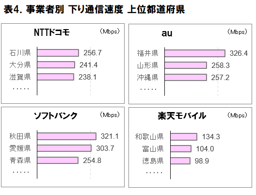携帯電話事業者別に下り通信速度が速い都道府県を見ると、NTTドコモは石川県(256.7Mbps)がトップ、大分県(241.4Mbps)、滋賀県(238.1Mbps)が続いた。auは福井県(326.4Mbps)がトップ、山形県(258.3Mbps)、沖縄県(257.2Mbps)が続いた。ソフトバンクは秋田県(321.1Mbps)がトップ、愛媛県(303.7Mbps)、青森県(254.8Mbps)が続いた。楽天モバイルは和歌山県(134.3Mbps)がトップ、富山県(104.0Mbps)、徳島県(98.9Mbps)が続いている。