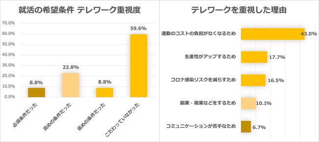 就活の企業選定でテレワークをどの程度重視していたかについては、「こだわっていなかった」59.6%と「低めの希望条件だった」8.8%を合算した68.4%が働き方としてテレワークを重視していなかった結果になり、重視派の回答は31.6%だった。「重視派」の回答理由として最も多かったのが、「通勤コストの負担がなくなるため」43.0%で、次いで「生産性がアップするため」17.7%、「コロナ感染のリスクを減らすため」16.5%の回答結果になった。