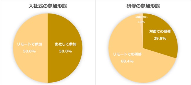 入社式の参加形態については、出社して参加の「対面式」が50.0%、リモートで参加の「リモート式」50.0%の回答結果になった。また、研修の参加形態については、「リモート研修」が68.4%で、「対面研修」が29.8%になった。入社式は対面とリモートが半数ずつで割れる一方、研修の参加はリモートが多数を占める結果になった。