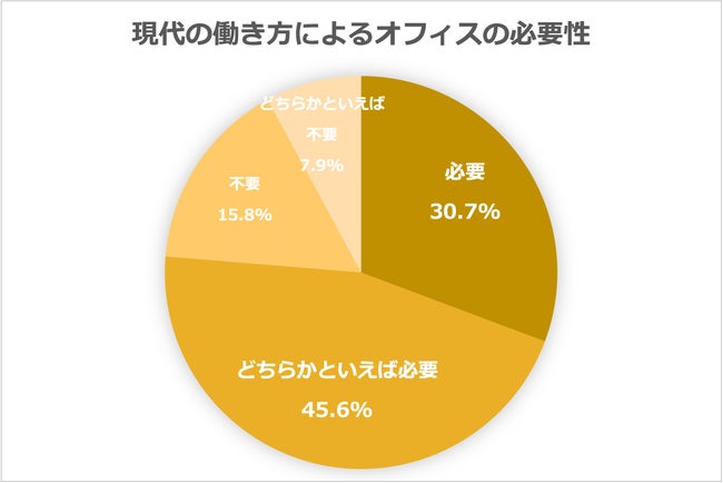 最後に現代の働き方においてオフィスの必要性を聞くと、「必要」30.7%と「どちらかといえば必要」45.6%を合算した76.3%が必要派の回答をする結果になった。