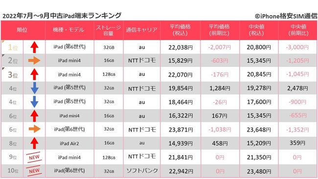 前回の調査(2022年4月~6月)では、取引数が増加したiPadだったが、今回の調査では13.4%減少となった。トップ10の顔ぶれに大きな変化はなく、iPad mini 4、iPad(第5世代)、iPad(第6世代)を中心に取引がされている。iPad mini 4は、2015年発売モデルながらも、サポート対象となっており、16GBでは15,000円前後で購入が可能。iPad(第5世代)やiPad(第6世代)は、サポート対象でありながら、発売当初の半額程度まで価格が下がっている。安さと機能性を求めるユーザーから支持された端末の取引が目立つ結果となった。
