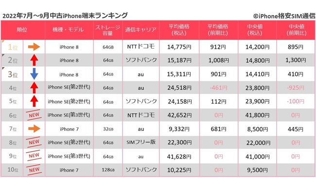 iPhone全体の中古取引数は、前回の調査(2022年4月〜6月)と比べ12.1%減少した。ランキングでは、前回同様、iPhone 8が上位3位を独占した。一方、大きく順位を上げたのが、iPhone SE (第2世代)・iPhone SE (第3世代)。iPhone SE (第2世代)躍進の理由は、2022年7月のApple製品一斉値上げが影響したと推察している。iPhone SE(第2世代)は、2020年発売と比較的新しい端末ながら、20,000円台という安価で手に入れられることから、機種変更を検討していたユーザーが新品ではなく、中古端末にシフトしたと見て良いだろう。一方のiPhone SE (第3世代)は、一部の家電量販店で実施されたキャリア版iPhoneセールによる買い替えにより、大幅に取引数が伸びたと見ている。また、Appleの開発者会議「WWDC 2022」でサポート終了が発表されたiPhone 7は、前回調査に引き続きランクインしているものの、iOS 16アップデートの対象外となるため、今後の需要は減っていくだろう。