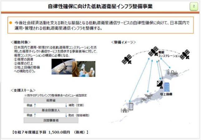 自律性確保に向けた低軌道衛星インフラ整備事業では、令和7年度補正予算に1500億円を計上し、日本国内で運用・管理される低軌道衛星コンステレーションを活用した衛星ダイレクト通信サービスを提供する事業者等を支援する。具体的には、衛星の調達、打上、地上設備の整備に対しての補助や、既存のデジタルインフラ整備基金を活用し、民間事業者へ助成を行う。