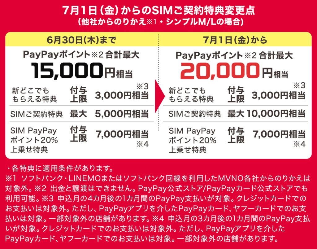 今回、この特典の好評を受け、「SIMご契約特典」の最大5000円相当を、のりかえの場合1万円相当に変更し、「新どこでももらえる特典」と「SIM PayPayポイント20%上乗せ特典」とあわせて、合計最大2万円相当のPayPayポイントが還元されるようになった。