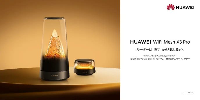 ファーウェイ・ジャパンは2026年2月27日、ルームライト機能を統合したメッシュWi-Fiルーター「HUAWEI WiFi Mesh X3 Pro」を、クラウドファンディングサイト「GREEN FUNDING」にて先行公開し、支援受付を開始した。市場想定価格は本体+中継機セットが43,780円(税込)、本体単体が28,380円(税込)。同日より渋谷TSUTAYAおよび二子玉川の蔦屋家電+でも展示が始まっている。