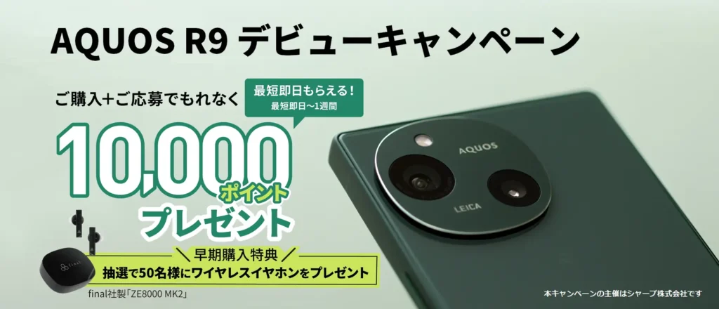 7月12日~9月1日の期間中に、NTTドコモまたはソフトバンクの「AQUOS R9」を購入の上、キャンペーンサイトから応募したユーザーにもれなく、1万ポイント(dポイント/PayPayポイントのいずれか)をプレゼントする。さらに、7月31日までに同キャンペーンに応募したユーザーの中から抽選で50名に、「Qualcomm Snapdragon Sound」対応のfinal社製ワイヤレスイヤホン(ZE8000 MK2)をプレゼントする。
