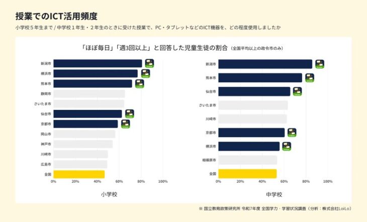 2025年12月8日、文部科学省が公表した「令和7年度 全国学力・学習状況調査」の結果を基に、ロイロノート・スクールを提供する株式会社LoiLoは、同サービスを採用している6つの政令指定都市におけるICT活用状況の分析結果を発表した。