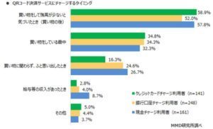 現在メインで利用しているQRコード決済サービスにチャージするタイミングについて聞いたところ、いずれの登録支払い方法・チャージ方法においても「買い物をして残高が少ないと気づいたとき(買い物の後)」「買い物をしている最中」「買い物に関わらず、ふと思い出したとき」の順となった。