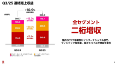 楽天グループは11月13日、2025年度第3四半期の連結決算を発表した。売上高は6286億円で前年同期比10.9%増、Non-GAAP営業利益は386億円で同212.8%増と大幅な増益となった。国際会計基準(IFRS)ベースの営業利益も8億円で前年同期比1379.7%増と黒字転換を果たした。モバイル事業の赤字は続いているものの、インターネットサービスやフィンテックなど全セグメントで2桁の増収を達成し、グループ全体の利益拡大を牽引した。