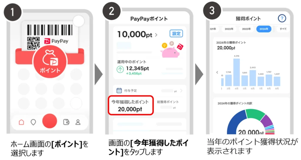 普段の買い物で付与された「PayPayポイント」や、各種キャンペーンなどに参加して獲得したポイントを棒グラフで年間、または月間で表示。「PayPayポイント」が付与されたキャンペーンやサービス、獲得方法(特定商品の購入やポイント交換)などを分類し、内訳の概要を円グラフで、詳細を円グラフの下に表示される。