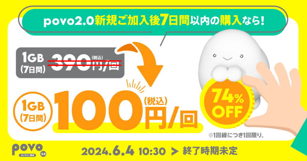 KDDI、沖縄セルラーはpovo2.0において、新規加入後の7日間限定で通常よりリーズナブルに利用できる「ウェルカムトッピング」の提供を開始する。なお、トッピング内容は随時入れ替わり、第1弾では通常390円の1GB(7日間)を100円で試すことができるとのことだ。