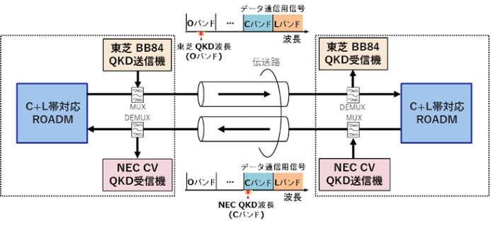 今回の実証は、長年の課題だったQKDと大容量光通信の共存という技術的障壁を突破する画期的な成果だ。NICT量子ICT協創センターに構築されたOpen APN向けの光伝送環境(NEC製「SpectralWave WXシリーズ」等を活用)において、東芝のBB84方式とNECのCV方式という2種類のQKDプロトコルを、25kmの同一光ファイバ上で8時間連続安定して多重化・鍵生成に成功。これにより、QKD専用の新規回線を敷設せずとも、既存のキャリアネットワーク上に低コストで安全な量子暗号通信を実装できる可能性が示された。