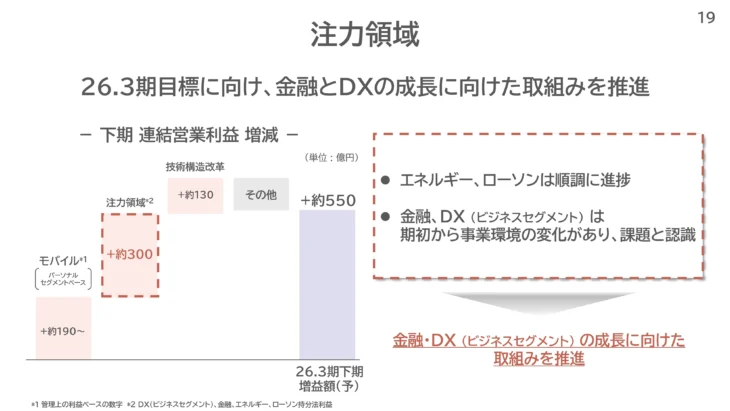 通期での目標達成に向けて金融とDXの2つのセグメントを注力領域としており、金融では「auマネ活プラン+」と「au PAYゴールドカード」との連携を高めていく狙いだ。DX(ビジネス)セグメントでは課題となっているBPO事業、SI関連事業のターンアラウンドを完了させ、大幅な増益が期待される。