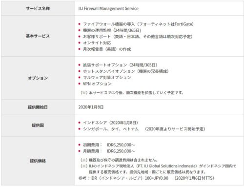 IIJ Firewall Management Serviceは、今後の展開と販売目標としては、インドネシアを皮切りに、2020年度には、同サービスをシンガポール、タイ、ベトナムのIIJグループ海外現地法人から提供する予定で、さらに中国、米国、ヨーロッパなどASEAN以外の地域への展開と、その他セキュリティサービスのラインアップ拡充も順次進め、今後3年以内にASEAN地域にて、約150社の導入を目指すとのこと。