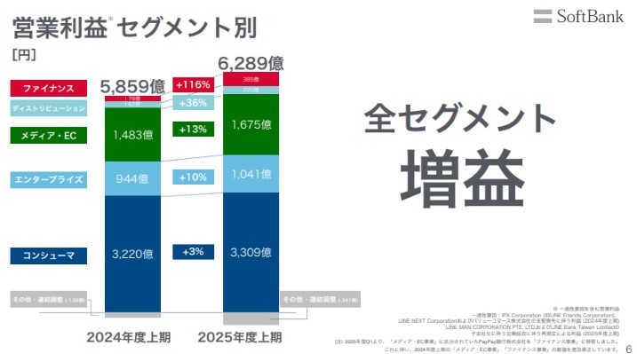 法人向けICTやAI関連製品、PayPayを中心とする決済事業の好調が利益拡大を支え、通期計画(営業利益1兆円)に対する進捗率は63%と順調に推移した。上期はディストリビューション事業とファイナンス事業が成長を牽引し、全セグメントで増益を確保した。